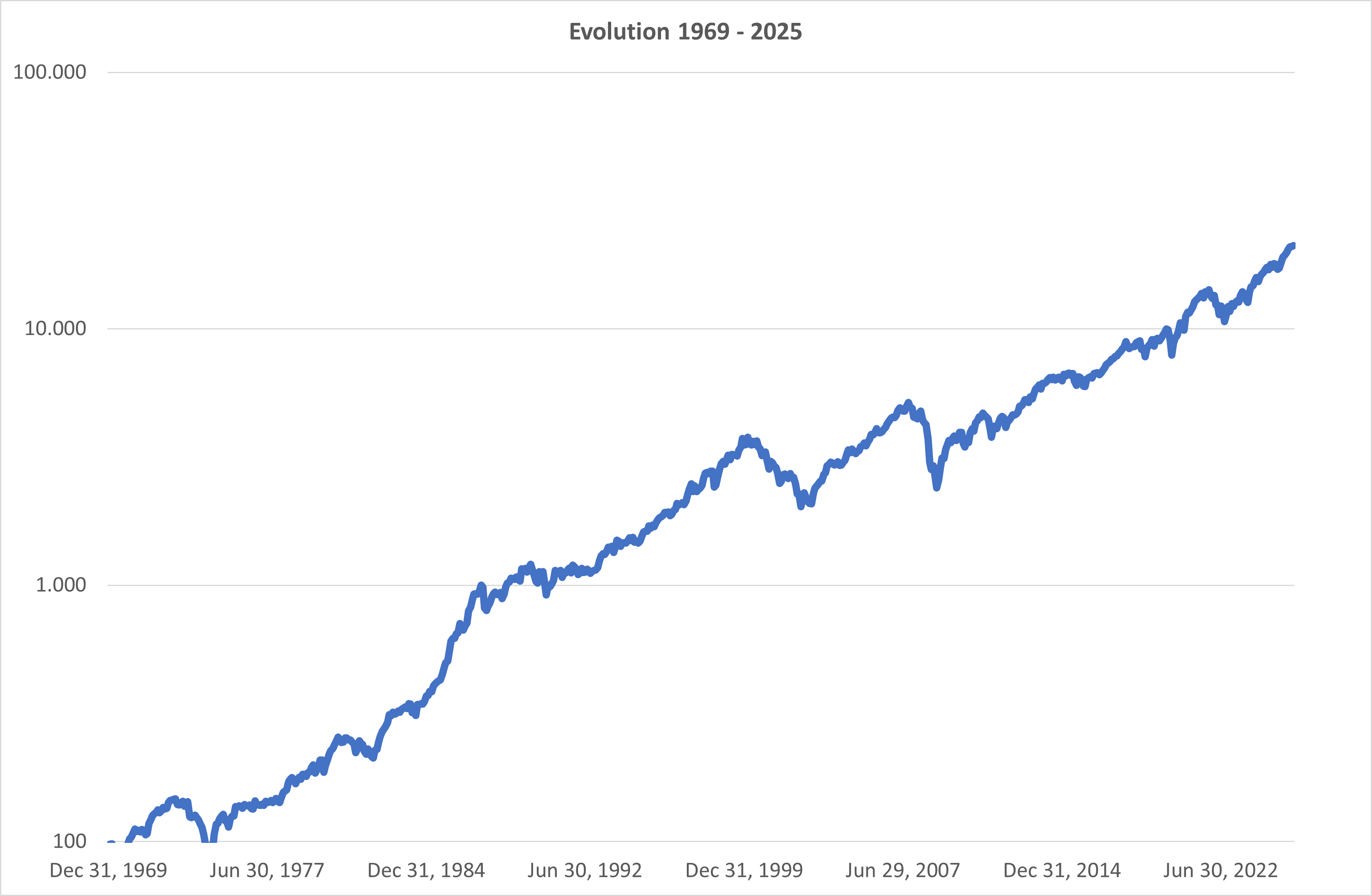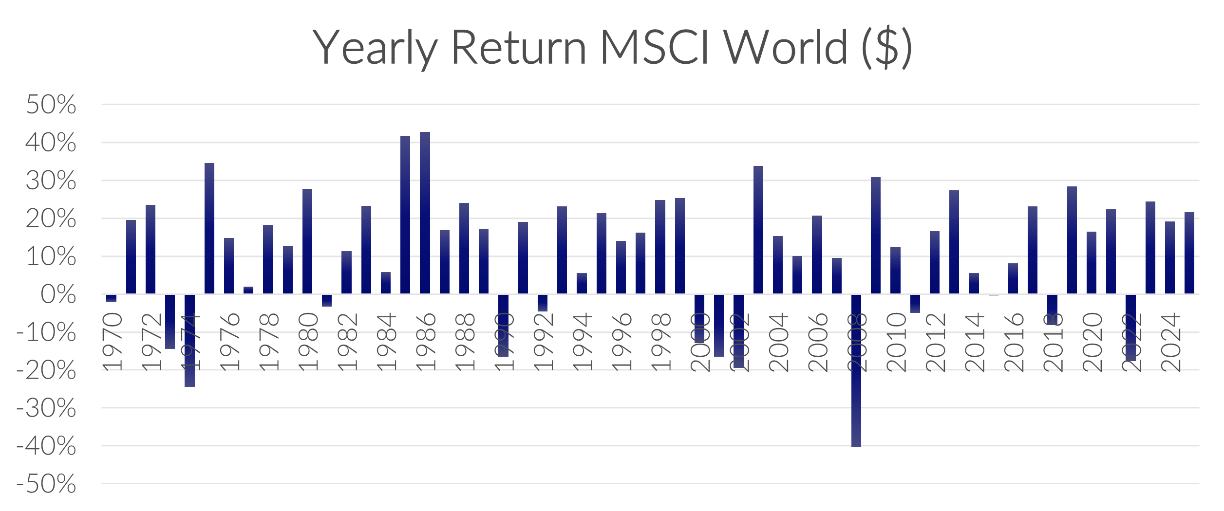 De cijfers zijn gebaseerd op de evolutie van de MSCI World Gross Return Index (USD) van 31/12/1969 tot 31/12/2025 (bron: MSCI.com), tenzij anders vermeld. Rendementen uit het verleden bieden u geen enkele garantie voor de toekomst.