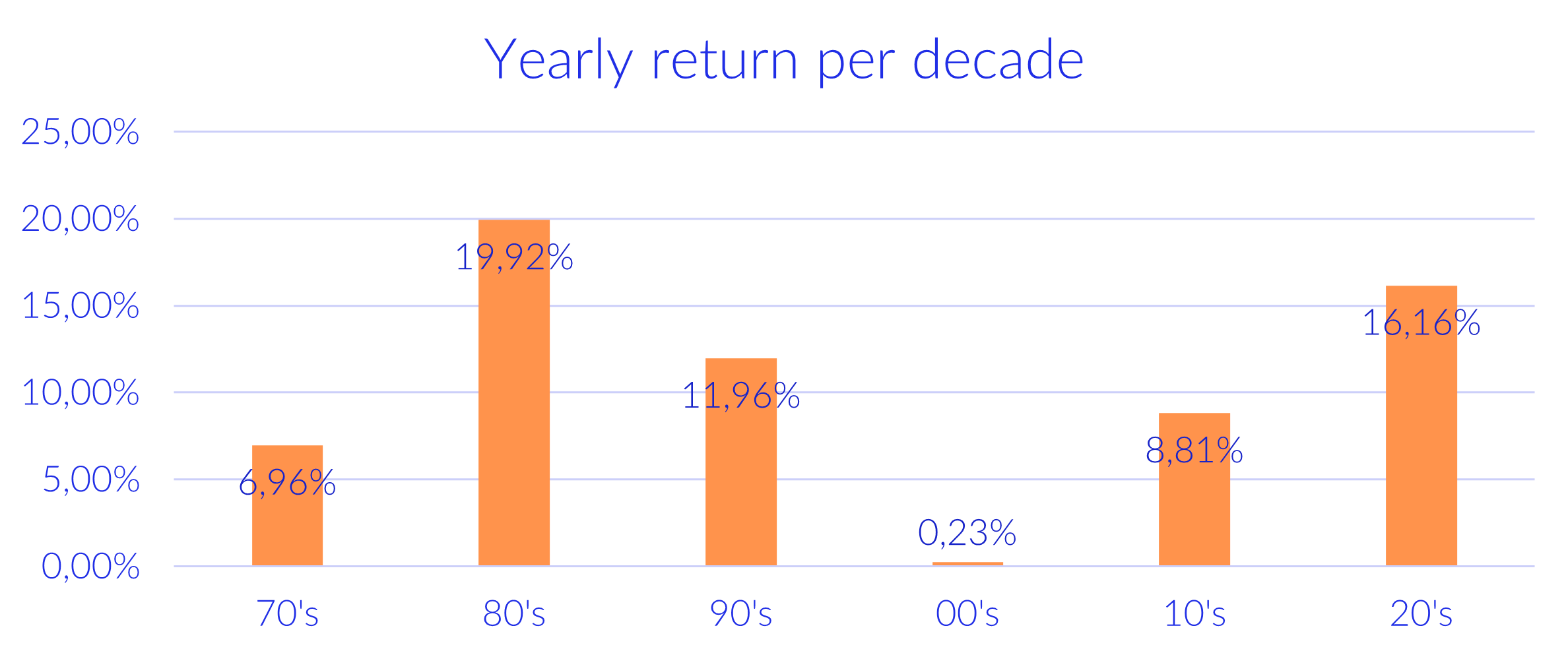 En het huidige decennium? Staat ook lekker in de hitlijsten: na 6 jaar is de index al verdubbeld (+111%), goed voor een geannualiseerd rendement van 16%. Kunnen we dankzij AI straks zelfs de eighties overtreffen?