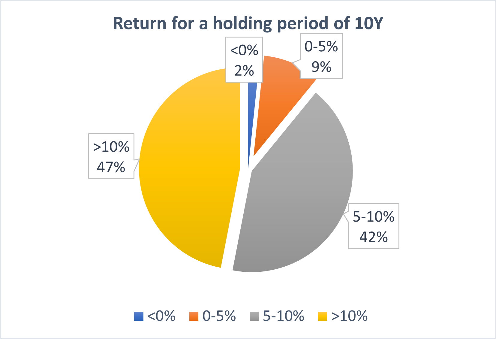 Wie in het verleden in de MSCI World stapte, had na 10 jaar in 90% van de gevallen een jaarlijks rendement van meer dan 5%. In bijna de helft van de periodes van 10 jaar lag het rendement zelfs boven 10%. Maar er zijn ook pechvogels: er was in het verleden 2% kans dat u na 10 jaar nog steeds verlies had. Denk aan wie eind 1998 instapte, 10 jaar later zat de beurs midden in de financiële crisis.