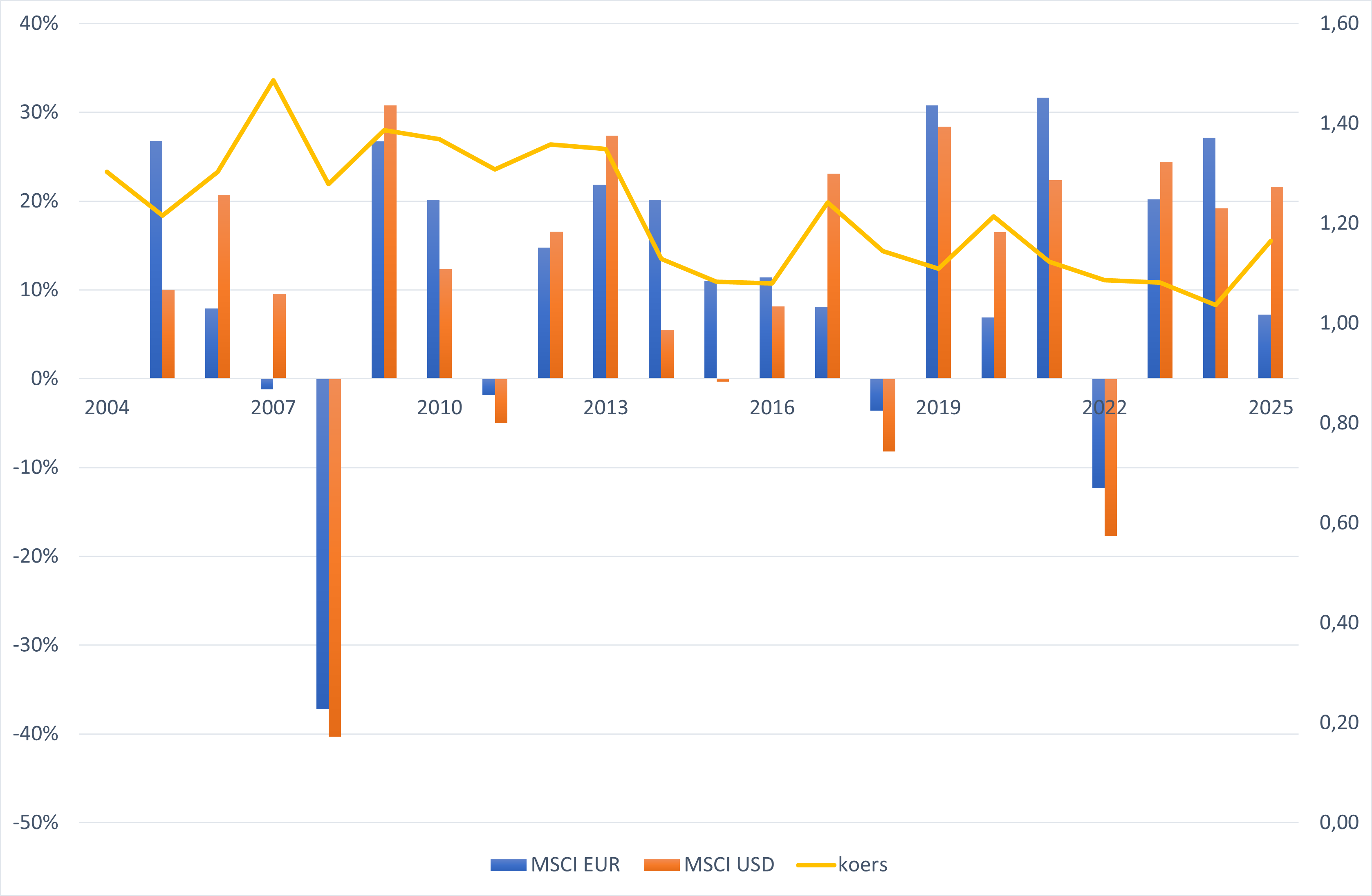 Nog een weetje: in de 4 negatieve jaren van de afgelopen 20 jaar deed de EUR-index het telkens iets beter. Toeval? Waarschijnlijk niet. In crisissen zoeken beleggers een veilige haven – en historisch gezien was dat vaker de dollar. Een stijgende dollar is dus goed nieuws voor eurobeleggers.