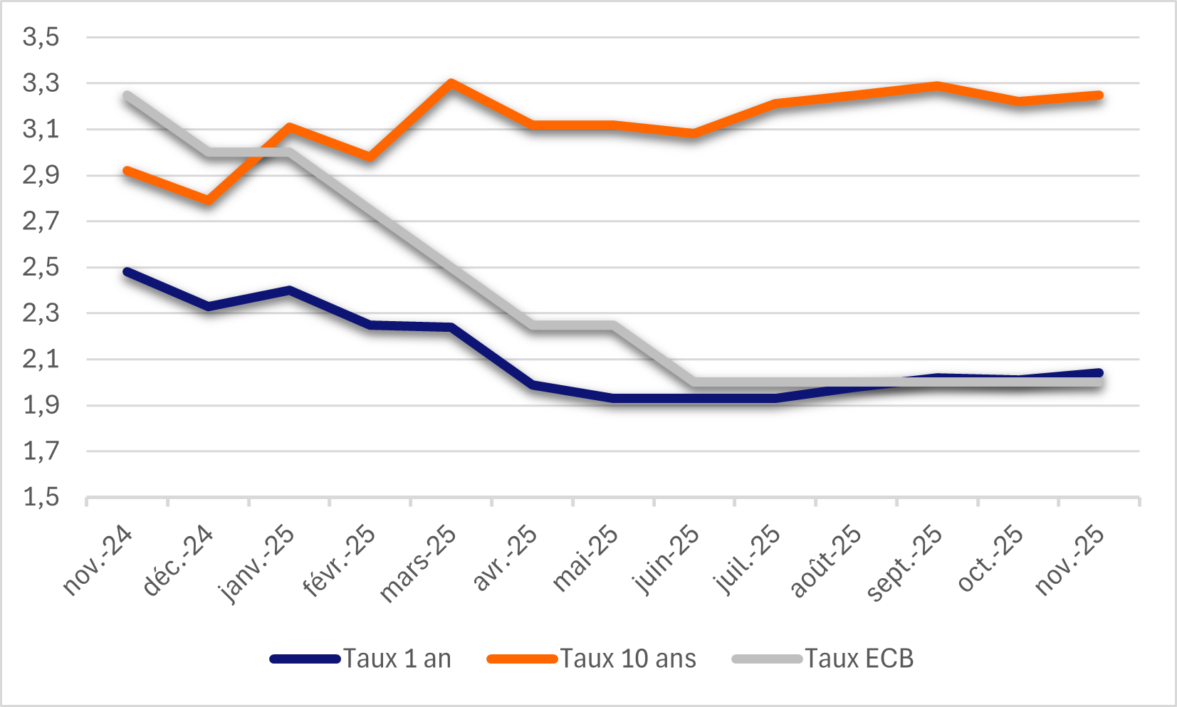 Après des années de resserrement, le vent a tourné. En 2025, la Banque centrale européenne (BCE) a abaissé le taux à cinq reprises, à 2 % à l’heure actuelle. L’objectif : stimuler l’économie et stabiliser l’inflation autour de 2 %.
