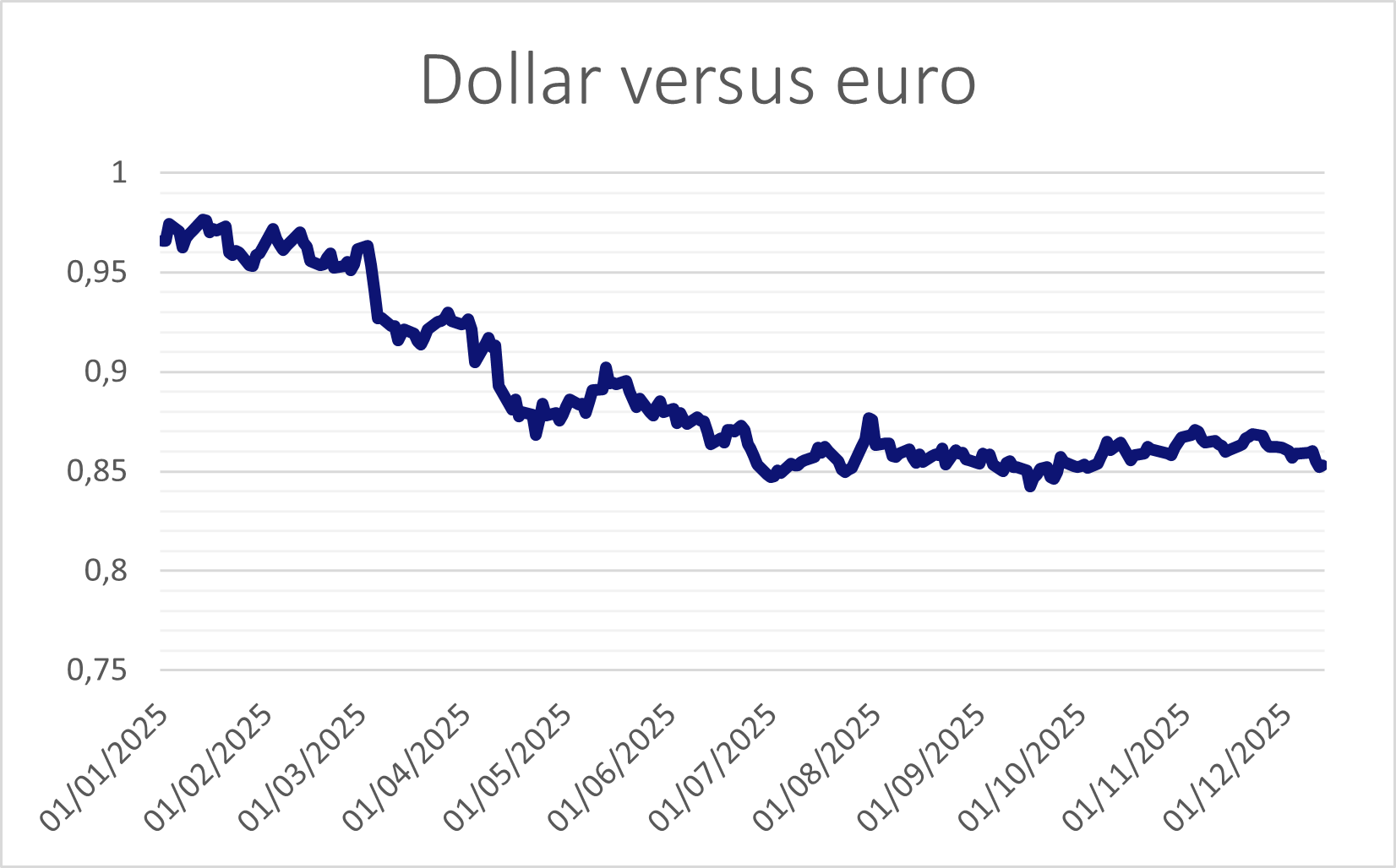 En 2025, le dollar américain a connu son pire premier semestre sur une période de plus de 50 ans. Au début de l’année, un dollar valait 0,97 euro ; en juin, seulement 0,86 euro. Le cours est resté plutôt stable au deuxième semestre. Sur base annuelle, le dollar a perdu quelque 11 % de sa valeur.