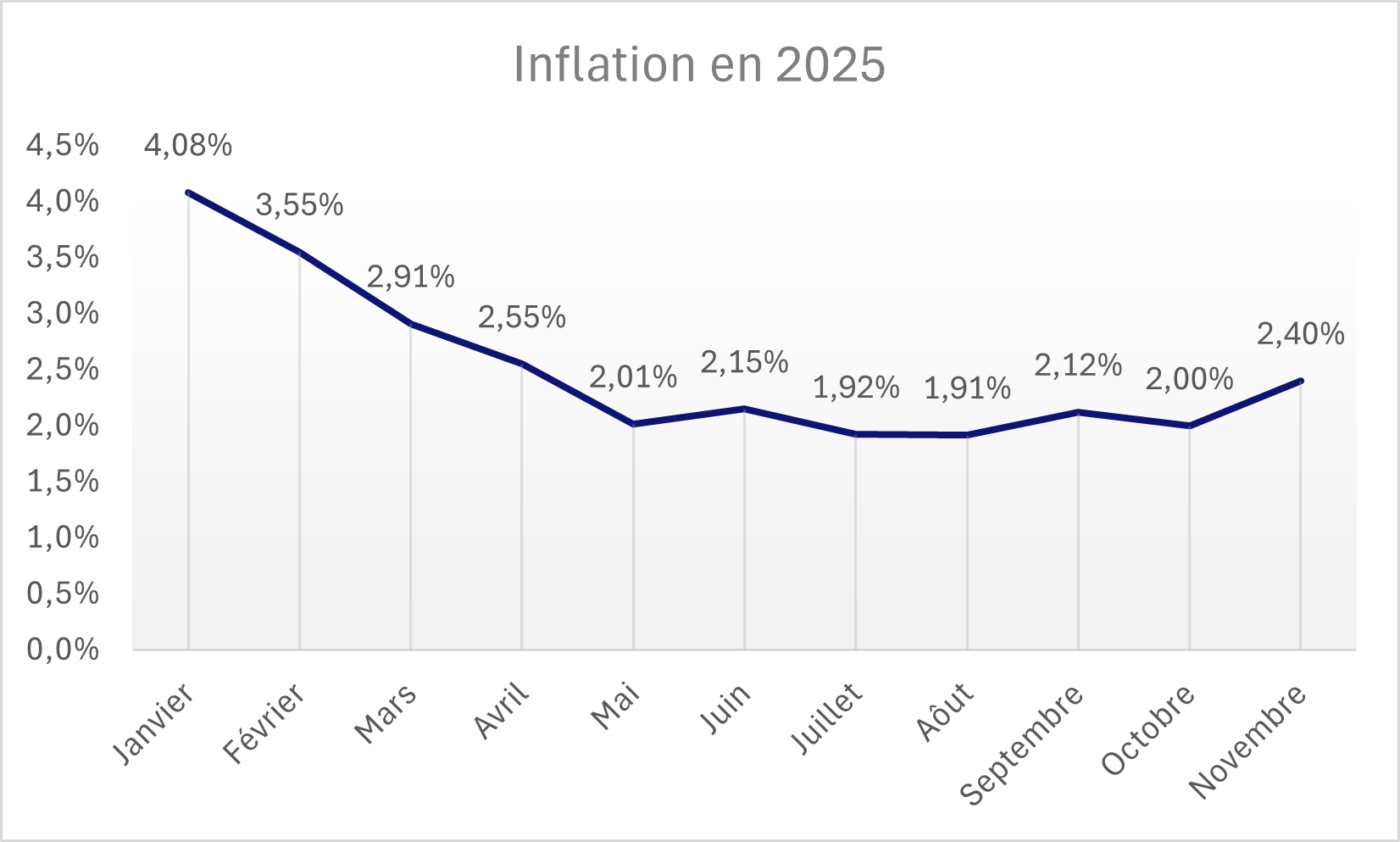 L’inflation belge s’est clairement atténuée en 2025. Alors qu’elle s’élevait encore à 4,1 % en janvier, elle est tombée à 1,9 % dans le courant de l’été, en deçà de l’objectif de 2 % de la BCE. Vers la fin de l’année, on observe une légère hausse.