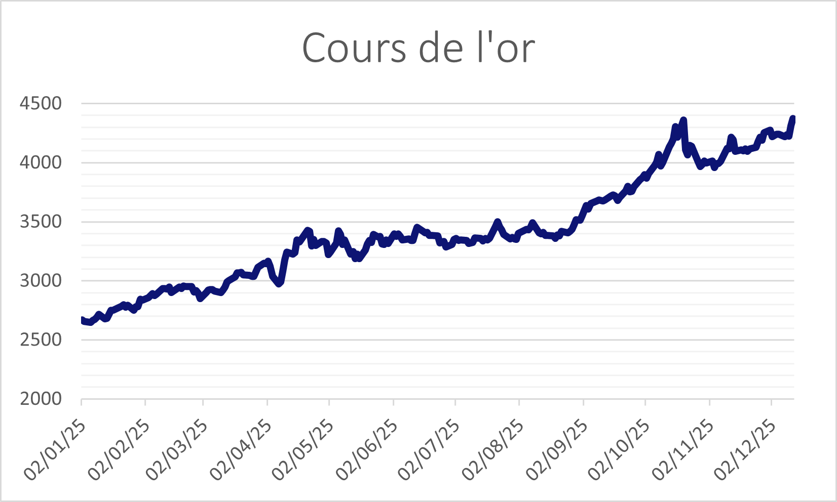 Si 2025 a été une année turbulente sur les marchés boursiers, la plupart des places boursières parviennent cependant à clôturer l’exercice dans le vert. Les taux d’intérêt et l’inflation sont revenus à des niveaux normaux. En revanche, l’or a atteint un cours record. Cet article a été rédigé le 12 décembre 2025.