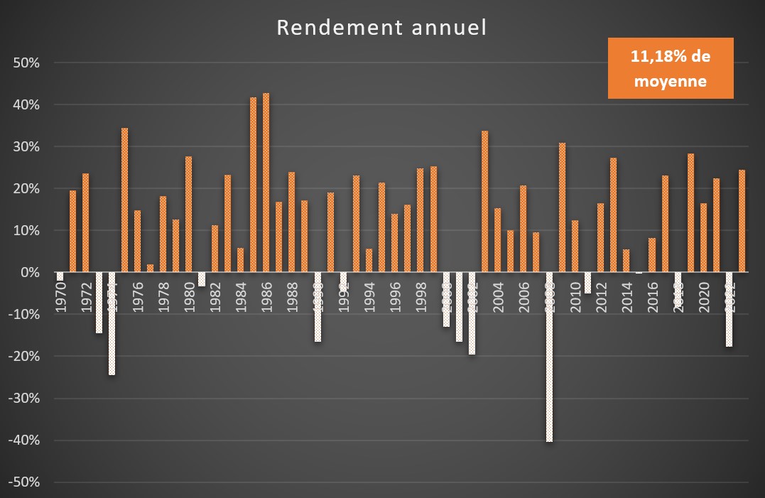 L'indice a vu le jour le 31 décembre 1969 avec un cours de 100 dollars. En tenant compte des dividendes qui ont été réinvestis (rendement brut), le cours s'élevait au 31 janvier 2024 à 14 735 dollars. Une personne qui aurait investi 1 000 dollars à la création du fonds disposerait aujourd'hui d'un montant de 147 735 dollars. Cela correspond à un rendement annualisé de 9,67% ! Le rendement annualisé tient compte de l'effet de l'intérêt composé.
