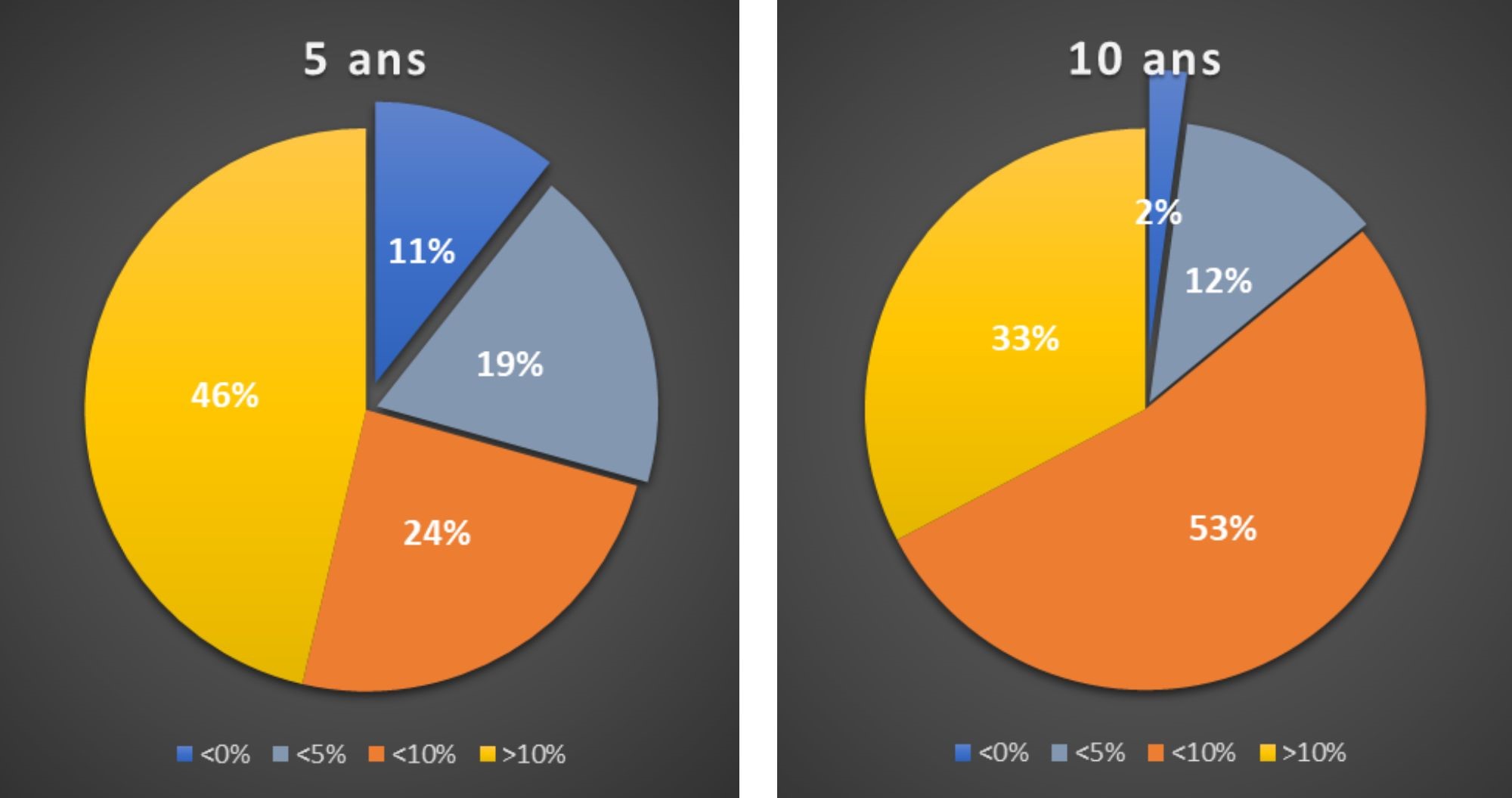 Un investissement en actions, même s'il est bien réparti, n'est pas sans risques. Ces derniers s'atténuent pour un horizon de placement suffisamment à long terme. Pour un horizon à cinq ans, le risque de rendement négatif atteint 11%. Si vous portez votre horizon à dix ans, ce risque tombe à 2 %, et la possibilité d'un rendement supérieur à 5% passe de 70 à 80%.
