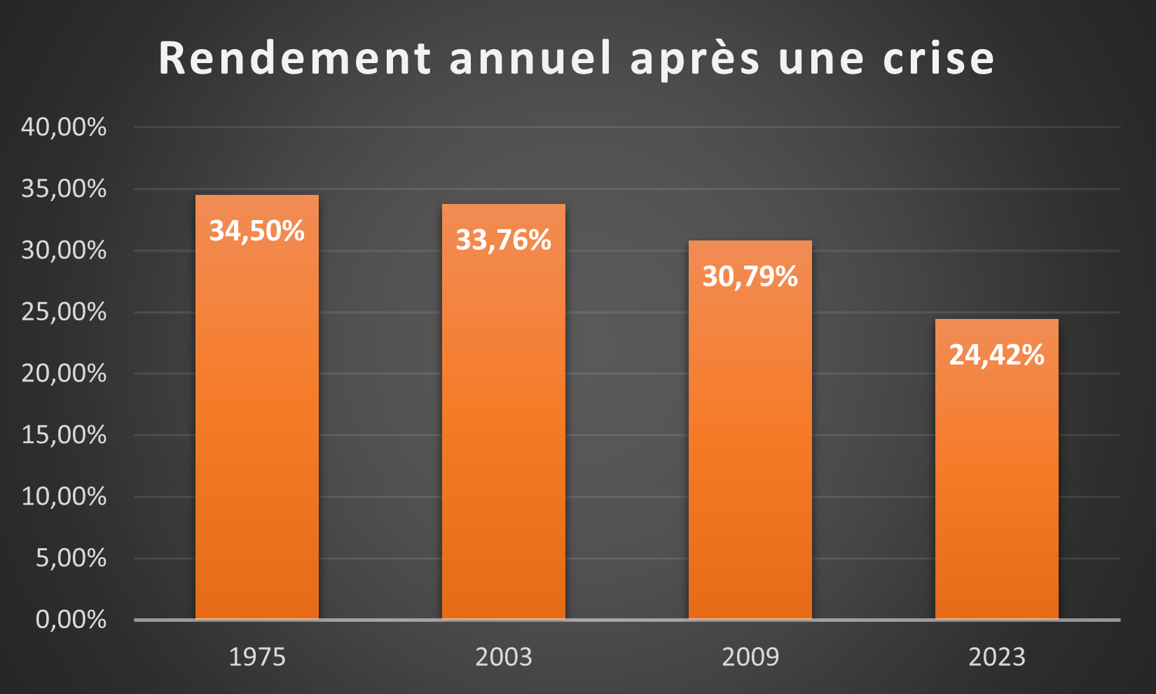 Le phénomène inverse se produit en cas de crise boursière. Les entreprises qui affichent de solides performances sont (injustement) sanctionnées. Quand la raison reprend ses droits, il y a donc des affaires à faire. L'histoire nous apprend que de beaux rendements ont déjà été constatés au cours de l'année suivant directement une crise boursière.