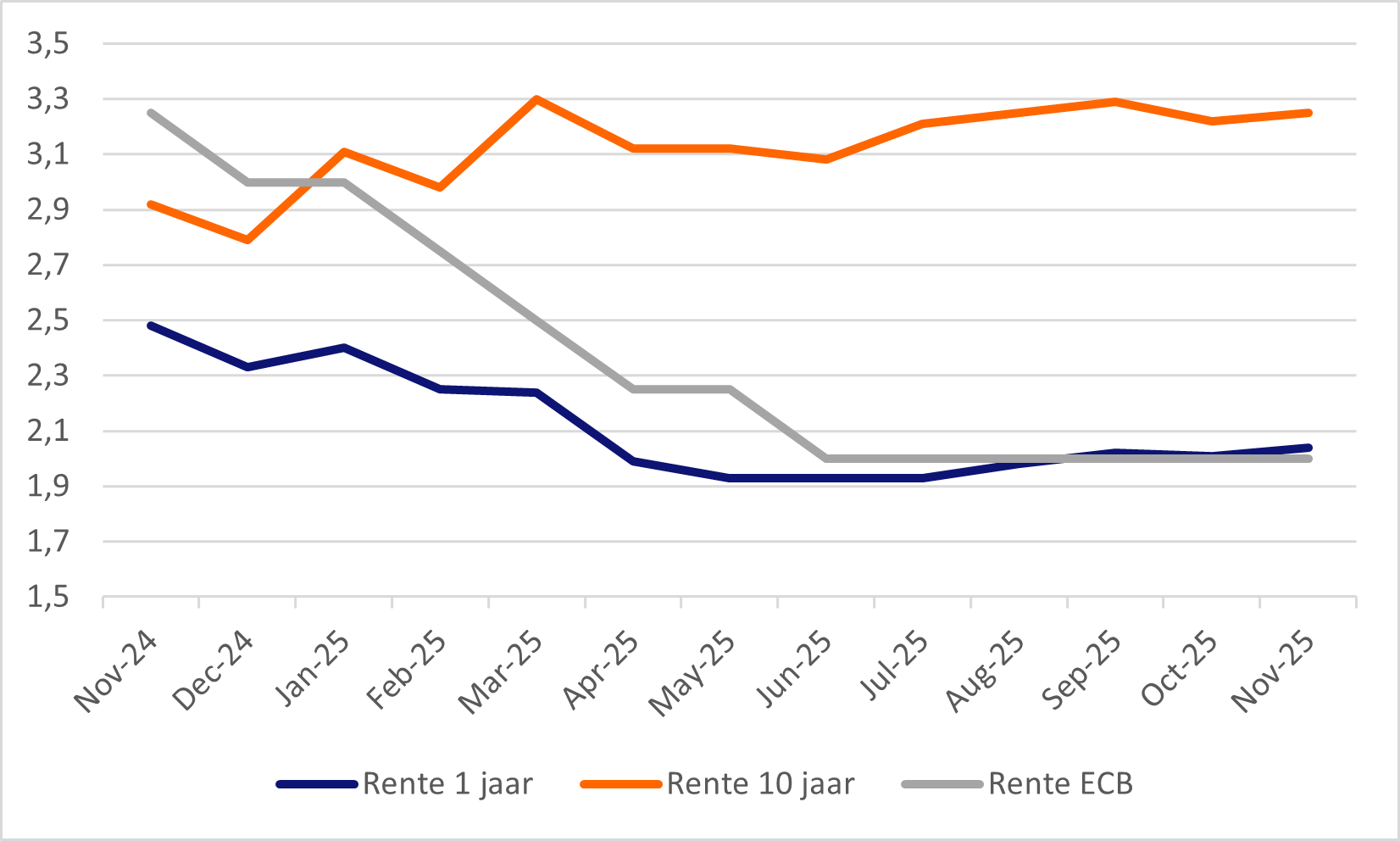 Na jaren van verkrapping is het tij gekeerd. De Europese Centrale Bank (ECB) heeft in 2025 vijf keer de rente verlaagd, waardoor de rente nu op 2% staat. Het doel: de economie stimuleren en de inflatie rond 2% stabiliseren.