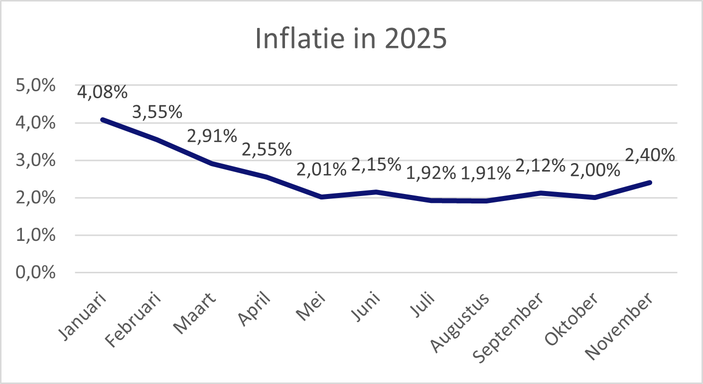De Belgische inflatie is in 2025 duidelijk afgekoeld. In januari bedroeg de inflatie nog 4,1%, maar in de zomermaanden daalde die naar 1,9%. De inflatie kwam zo onder het streefdoel van 2% van de Europese Centrale Bank. Naar het jaareinde toe zien we een lichte stijging.